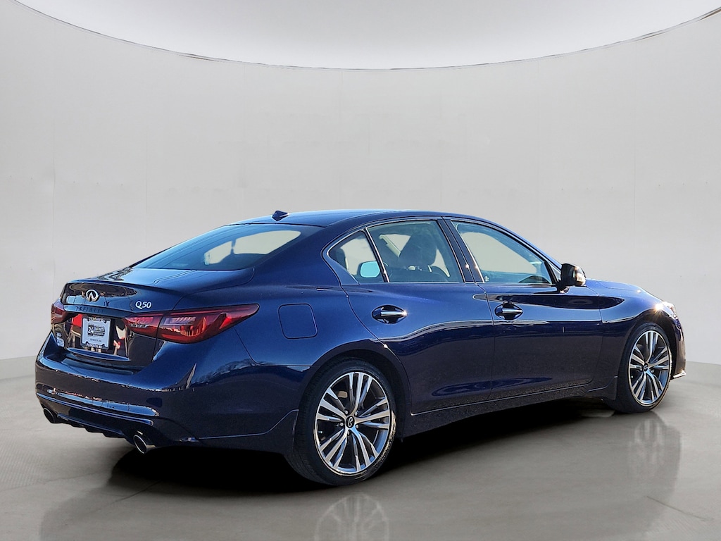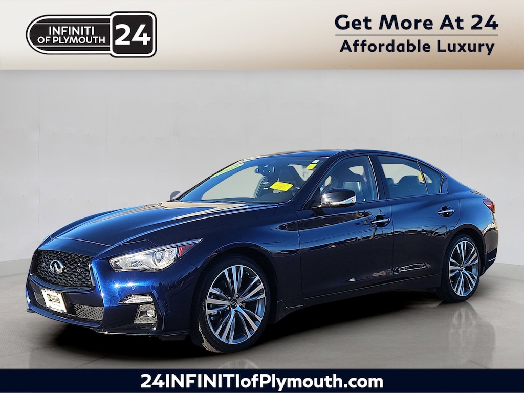 Experience luxury and power with this dark blue 2023 INFINITI Q50 AWD Sensory Sedan. Equipped with a robust 3.0L Twin Turbo V6 engine delivering 300hp, paired with a 7-speed shiftable automatic transmission and all-wheel drive for superior performance in any condition. Enjoy cutting-edge technology including Wireless Apple CarPlay and Android Auto, dual infotainment screens (7" and 8"), and a Bose premium audio system. Safety is paramount with features like a surround view camera system, front automatic emergency braking, adaptive cruise control, blind spot monitoring, rear cross traffic alert, and both visual and audible pre-collision warnings. The interior pampers with leather-trimmed upholstery, heated front seats and steering wheel, power moonroof, and memory settings for driver's seat and steering wheel. Stay connected with INFINITI InTouch smart device app compatibility, Wi-Fi hotspot, and real-time navigation with Google POIs and SiriusXM Travel Link. Aluminum alloy wheels and LED headlights/fog lights complete the sophisticated look. Discover refined driving-schedule your test drive today!